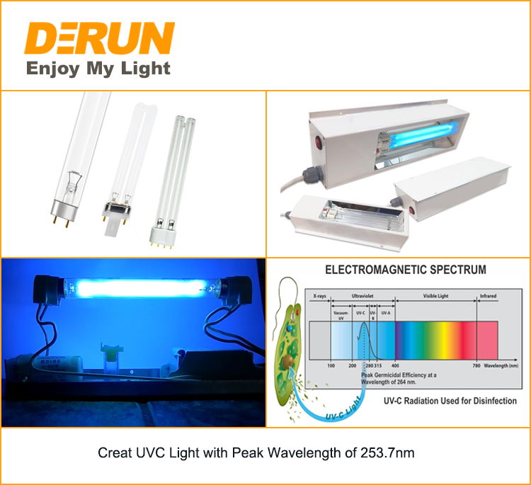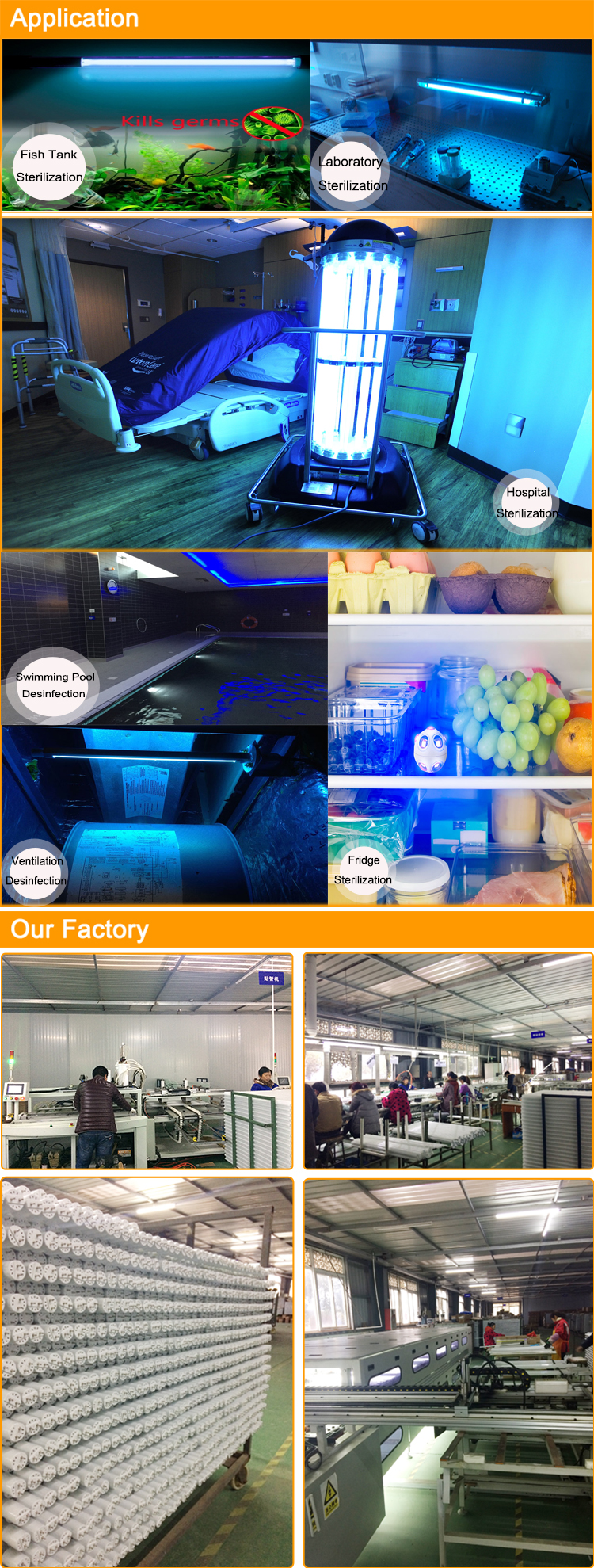 Features: 1. Radiating mainly short-wave ultr-violet rays of 253.7nm(UVC). The UVC has stron destructive effect on DNA systemiztion, inhibiting pathogen reproduction, and causing to die of germs 2. The lamp tube is made of special material, it can transmit more than 70% UV-C 3. Widely used in hospital disinfection, food sanitation, instrument disinfection, different sanitary places and leather aging.